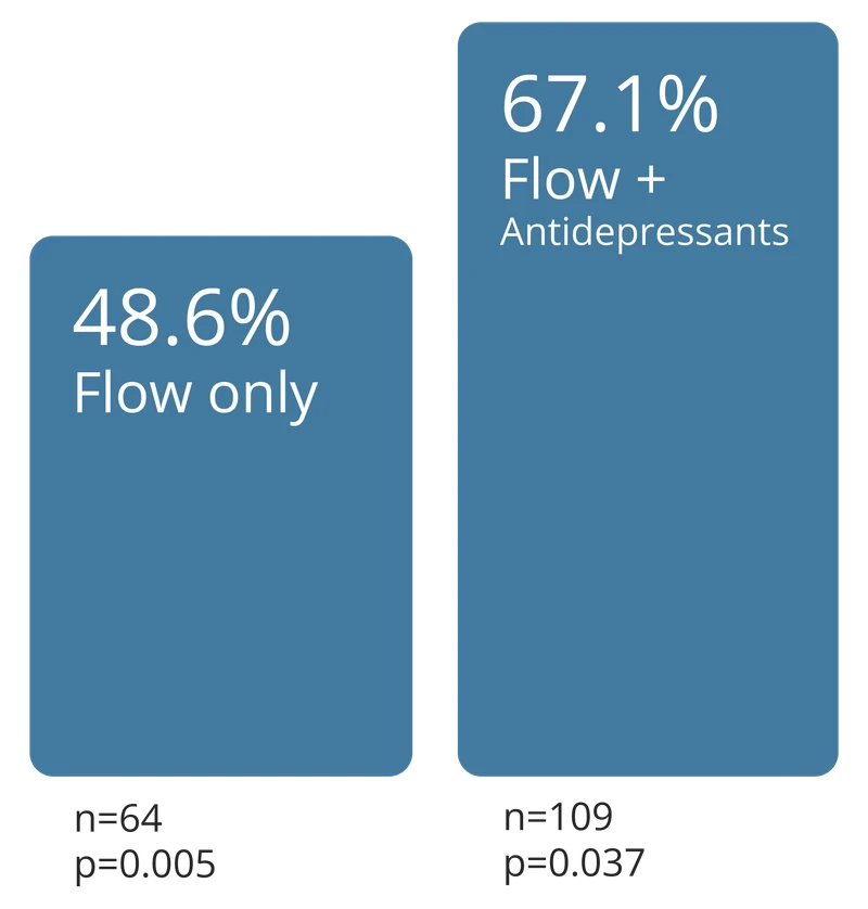 Results at 10 weeks from a multisite, double-blind placebo-controlled randomised superiority trial were statistically significant for both primary and secondary endpoints. Flow achieved a 57.5% remission rate using the MADRS scale and was effective as both standalone and adjunctive therapy.1